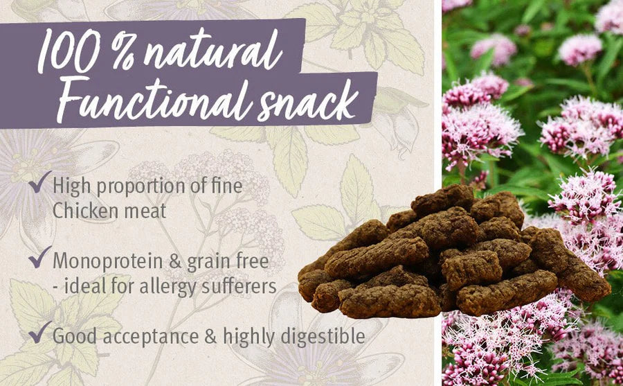 AniForte® Relax Snacks are a tasty and highly digestible treat made with a high proportion of chicken meat. The biscuit-like meat snacks are combined with a high-quality, natural herbal mixture of valerian root, hop leaves, lemon balmand passion flower herb.