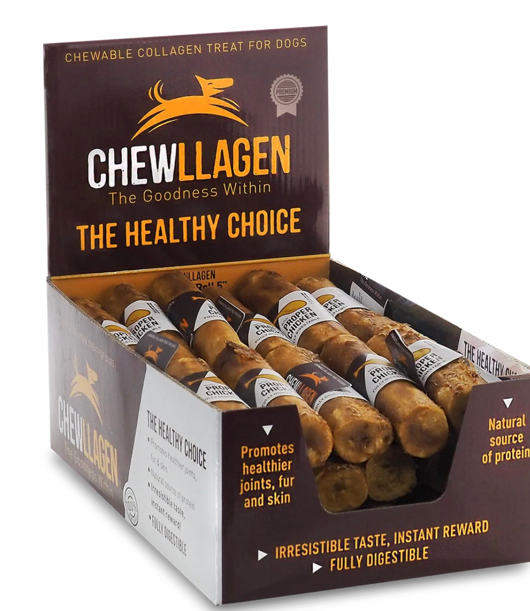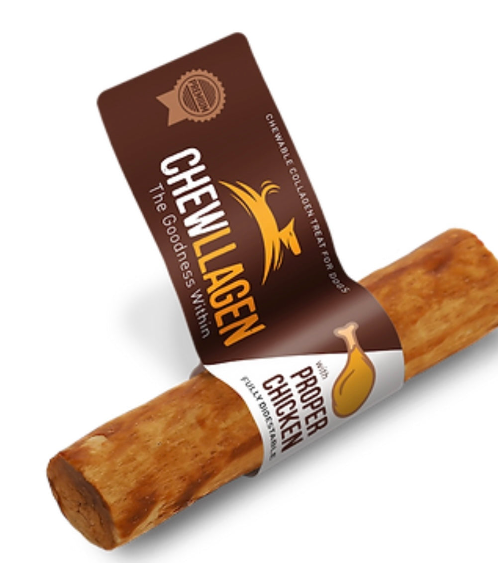 Chewllagen is a dog treat made from the collogen extracted from South American grass-fed cattle hide. The collagen proteins are hydrolysed and broken down through a heating process into the smaller and more easily digestible molecules.