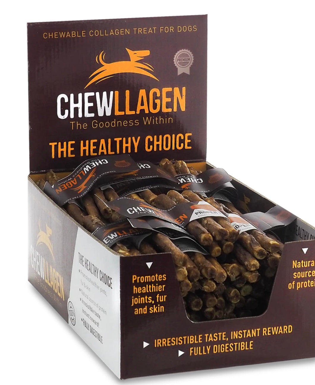 Chewllagen is a dog treat made from the collogen extracted from South American grass-fed cattle hide. The collagen proteins are hydrolysed and broken down through a heating process into the smaller and more easily digestible molecules.