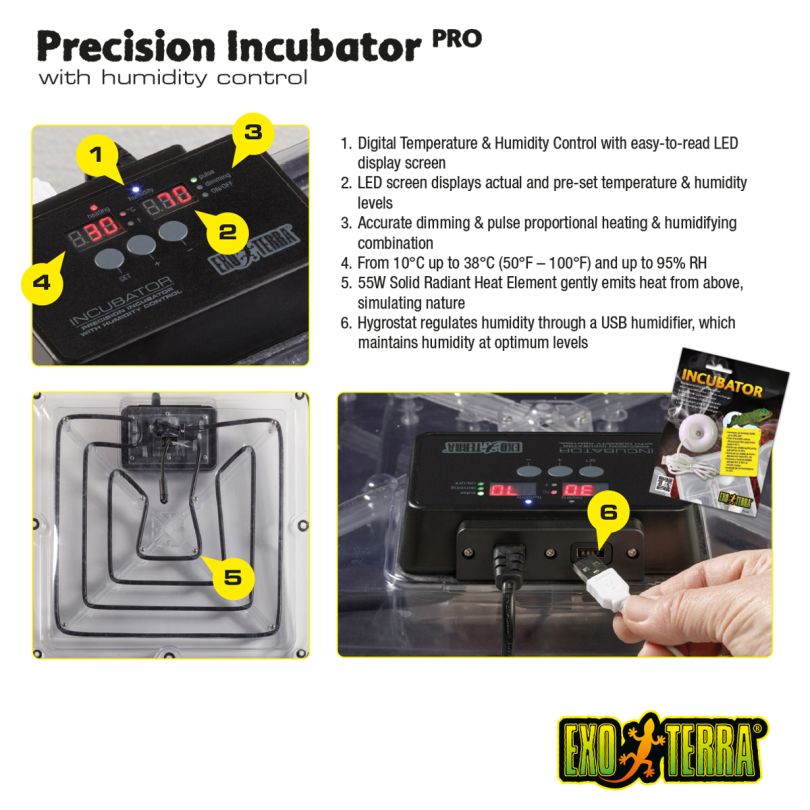 The Exo Terra Precision Incubator makes incubating reptile eggs safer than ever, and uncomplicated. This Precision Incubator includes a dimming/pulse proportional thermostat that accurately keeps the temperature, whilst the hygrostat regulates the relative humidity through the USB humidifier.