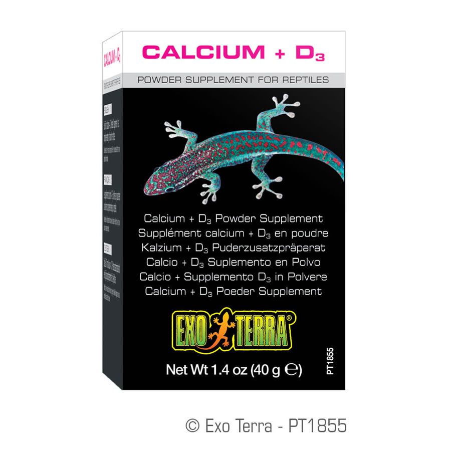 Calcium deficiency is a major dietary problem in captive reptiles. Exo Terra Calcium + D3 Powder Supplement contains high levels of phosphorus-free calcium as well as balanced amounts of vitamin D3 for optimal calcium absorption and to help ensure long-term health. Vitamin D3 aids in the proper absorption of calcium and is vital for captive reptiles not exposed to natural sunlight or ultraviolet lights. Exo Terra Calcium + D3 Powder Supplement is a complementary food for reptiles. Contains the essential elements for proper calcium metabolism Phosphorus free Ultra fine powder For reptiles