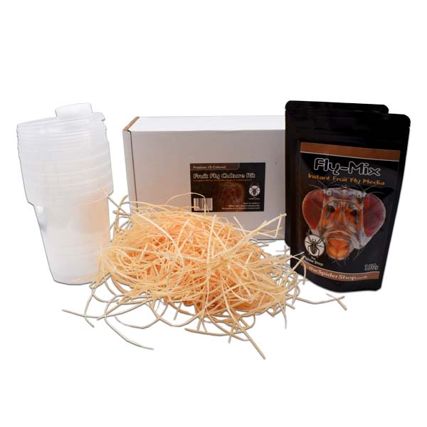 These kits comprise of the items seen in the main picture (except flies); containers, media and excelsior (wood wool) + instructions. With enough supplies to made 10 cultures.