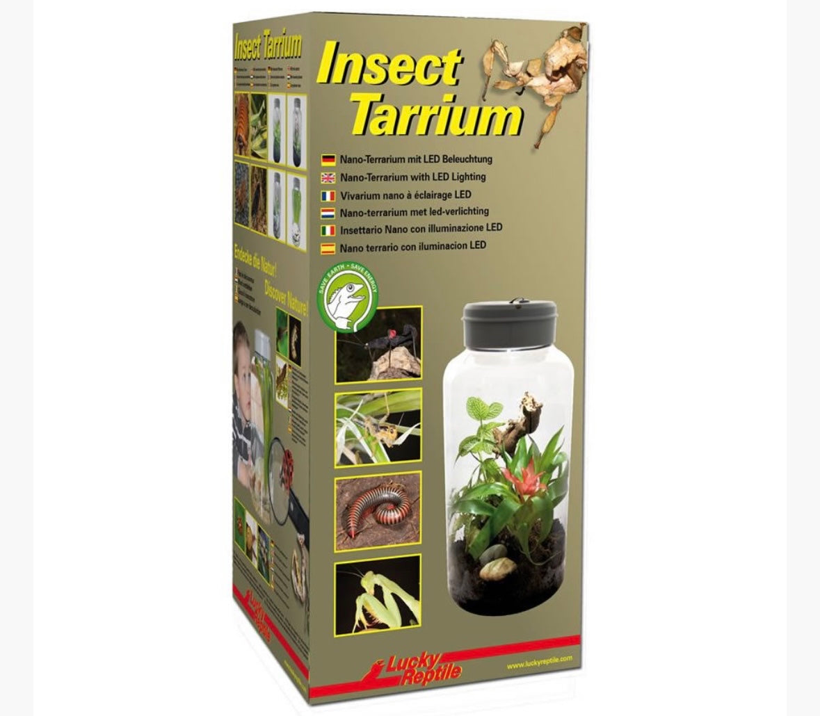 The cylinder-shaped InsectTarrium is an ideal container for many invertebrates, such as praying mantises, stick insects, beetles, spiders and even small water animals. The removable lid contains a fine-meshed ventilation gauze, a small hatch for easy feeding, two daylight and one moonlight LED. A light sensor turns on the moonlight-LED when it is getting dark. Perfect starter tank for children. 2 Year warranty.