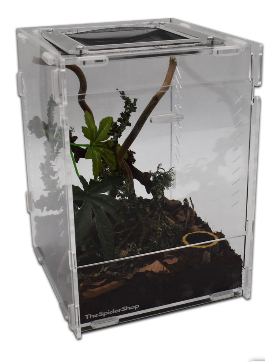A complete Jumping Spider set up that includes a TSS Acrylic arboreal enclosure which is a purpose built enclosure for Jumping Spiders with ultra fine ventilation to stop smaller specimens and fly’s escaping. Also included is décor set to make an attractive display, water bowl, substrate and Atomiser mister. All you need is the Jumping spider and suitable food.