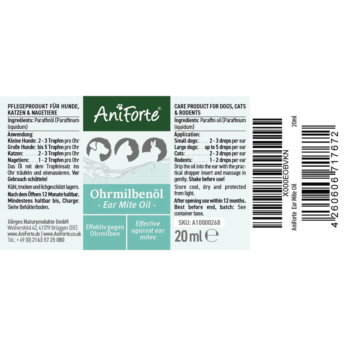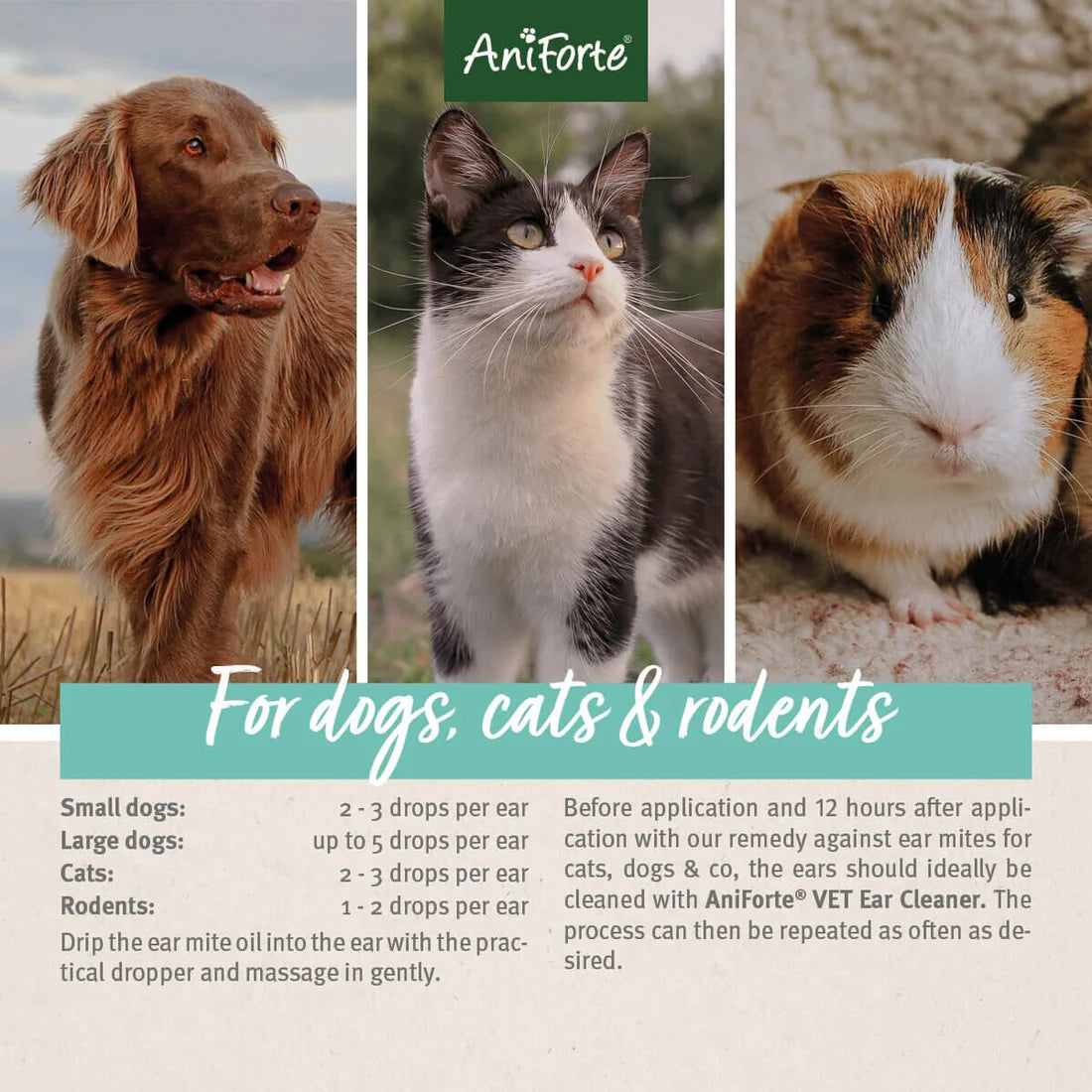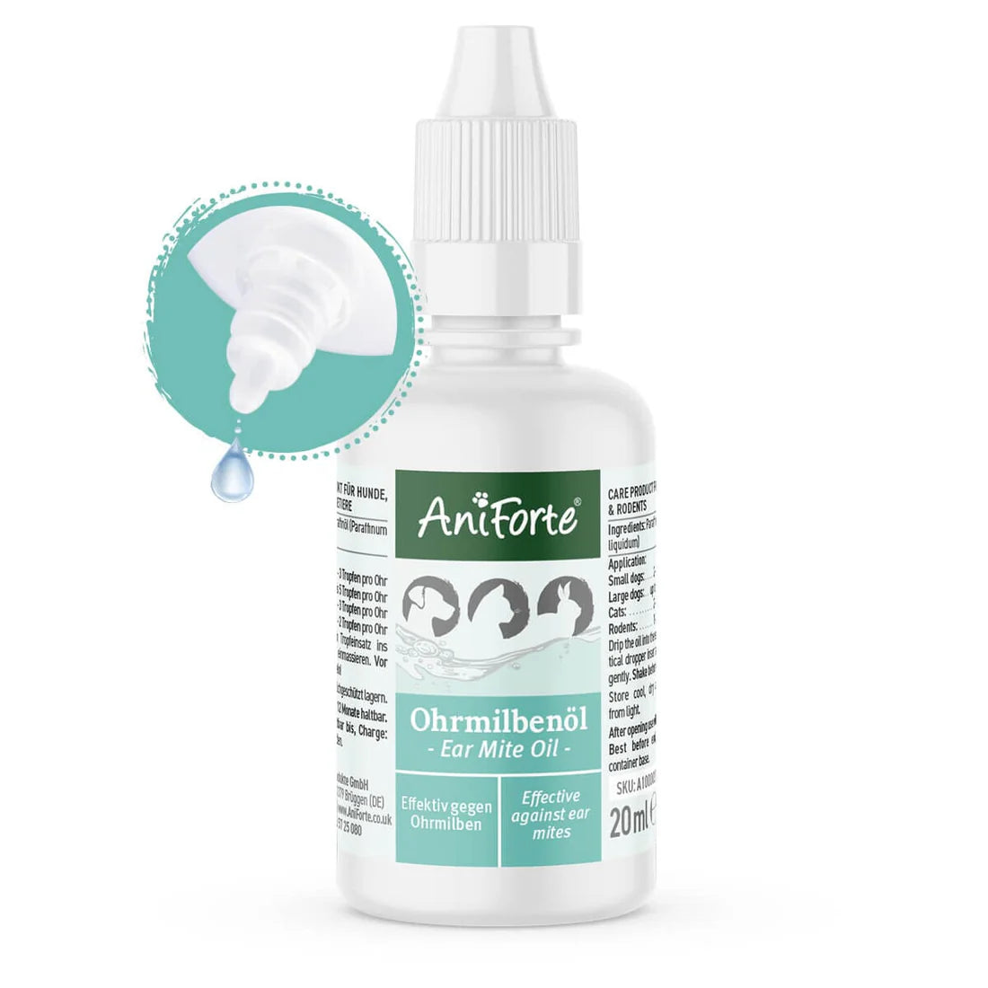 AniForte Ear Mite Oil Drops is a quick and safe ear care product that removes irritating ear mites in just a few days. It comes with a dropper-cap on the bottle, making it easy to measure the correct amount of formula to apply for your pet.