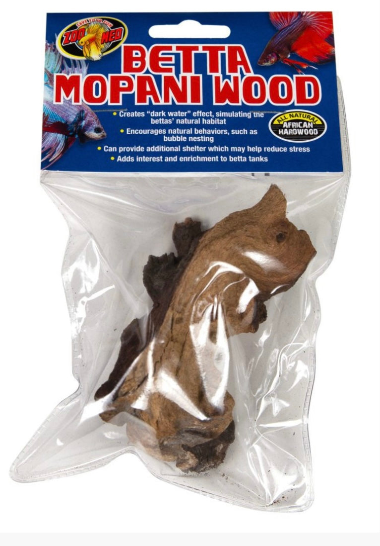 Zoo Med’s Betta Mopani Wood is a natural wood item that is designed to make the water chemistry of your Betta tank closer to what a Betta would experience in the wild. By placing this small piece of Mopani wood in your Betta tank it will naturally leach “tannins” which will give the water a light to dark brown tint plus lower the pH of your water. (Bettas in the wild live in water naturally tinted by decaying wood and leaves and with lower pH.) Should the water be too dark brown or not to your liking you can remove the Mopani wood and soak in a clean container of water continually changing the water until the shade goes from a dark brown to light brown or clear.