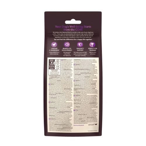 Our Wellness CORE Puppy Trainers Chicken Flavoured with Carrots are the best complement to our CORE dry and wet nutrition. It is a natural soft treat, crafted with a tasty protein, healthy antioxidants and linseed to support your puppy's well-being. They also support Brain & Eye Development thanks to the guaranteed levels of DHA from Salmon Oil. With an ideal size, our Puppy Trainers are perfect for training or just as a healthy guilt-free snack.