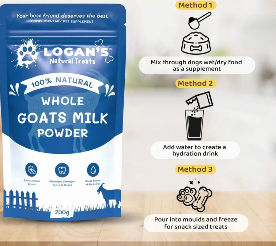 Create a delicious hydration drink for your furry friend by mixing 1 tbsp of whole goats milk powder with 1 cup of warm water; this will create 235mls of yummy goodness. It’s a tasty and healthy way to keep your pet hydrated and happy.